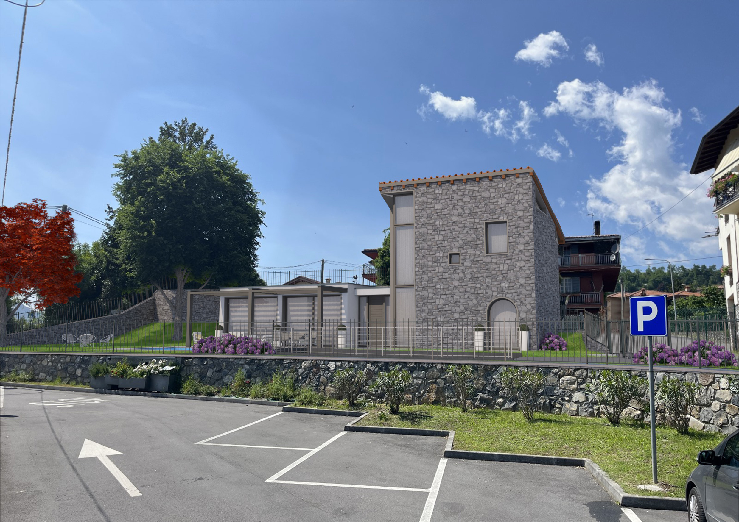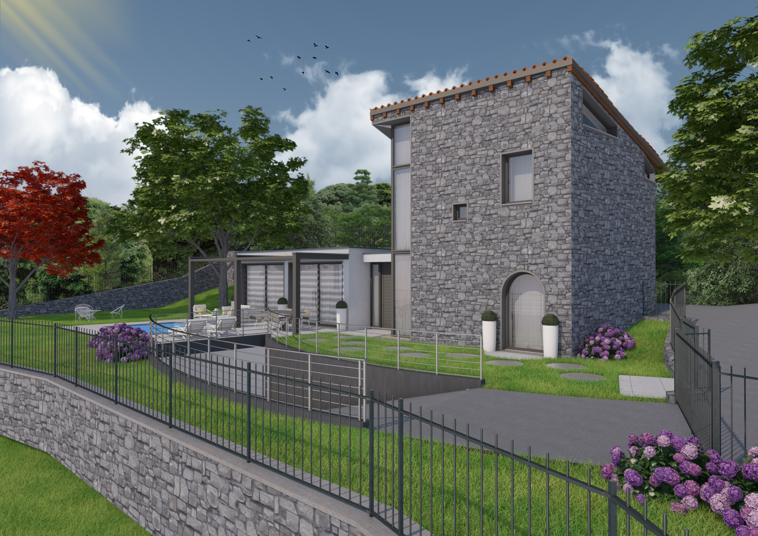 La proprietà unisce il fascino della pietra naturale della struttura originale al design contemporaneo di un volume moderno con ampia vetrata panoramica, ideale per godere della luce e del paesaggio circostante.